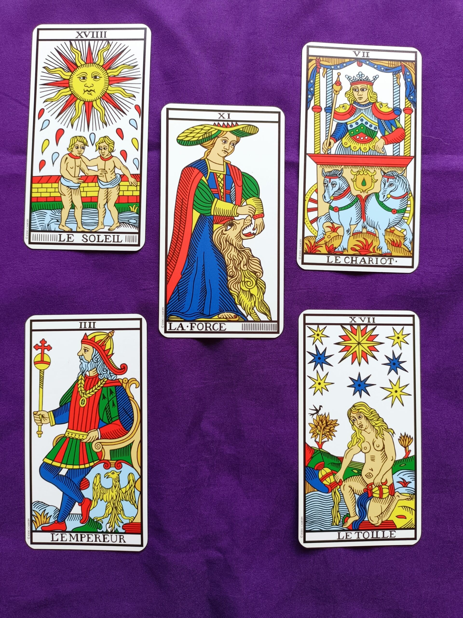 Hacemos 5 tiradas de cartas con una pregunta base para saber el estado de tu alma, 3 preguntas personalizadas sobre las opciones que tienes para mejorar tu vida presente y sobre cómo actuar frente a situaciones que te hacen dudar y una carta del Arcano Mayor para sostener. No se trata de adivinar el futuro sino de tomar las riendas de lo que está a tu alcance para que vengan momentos favorecedores.